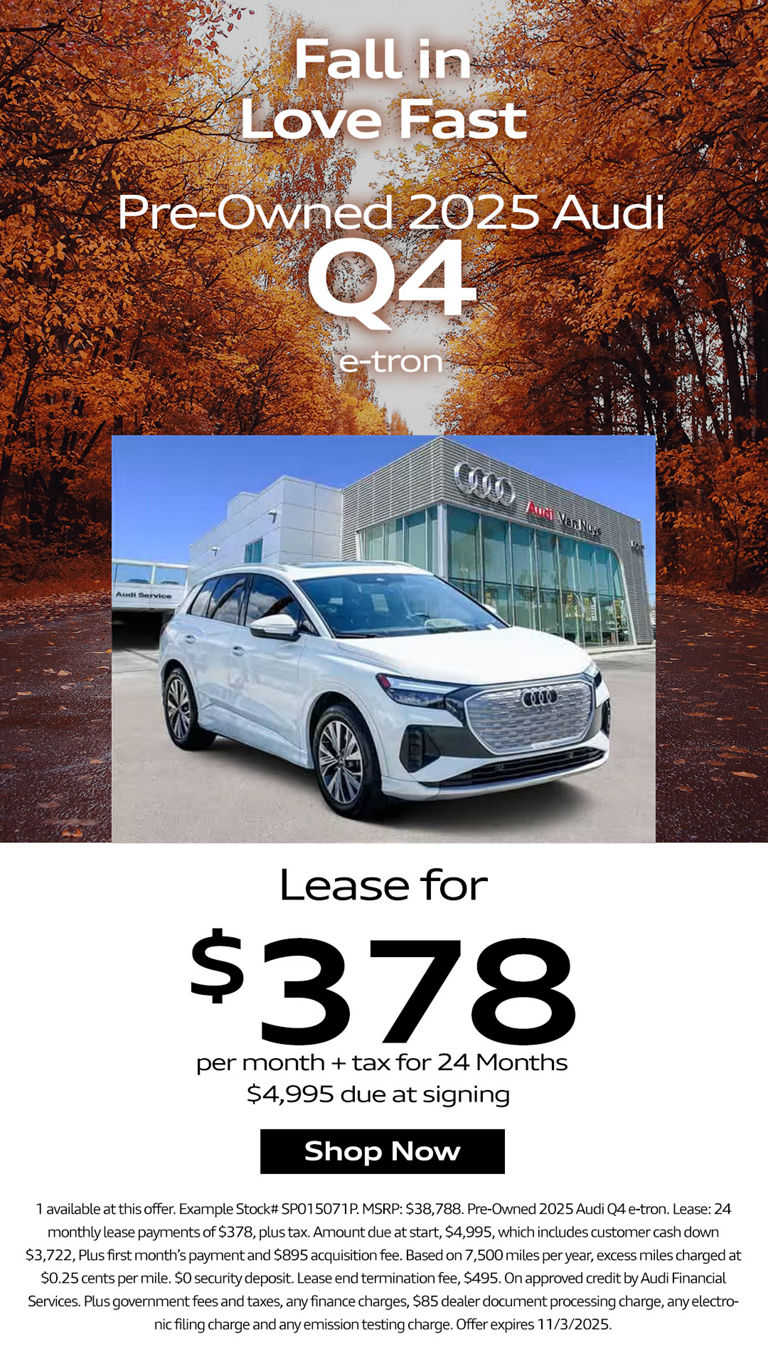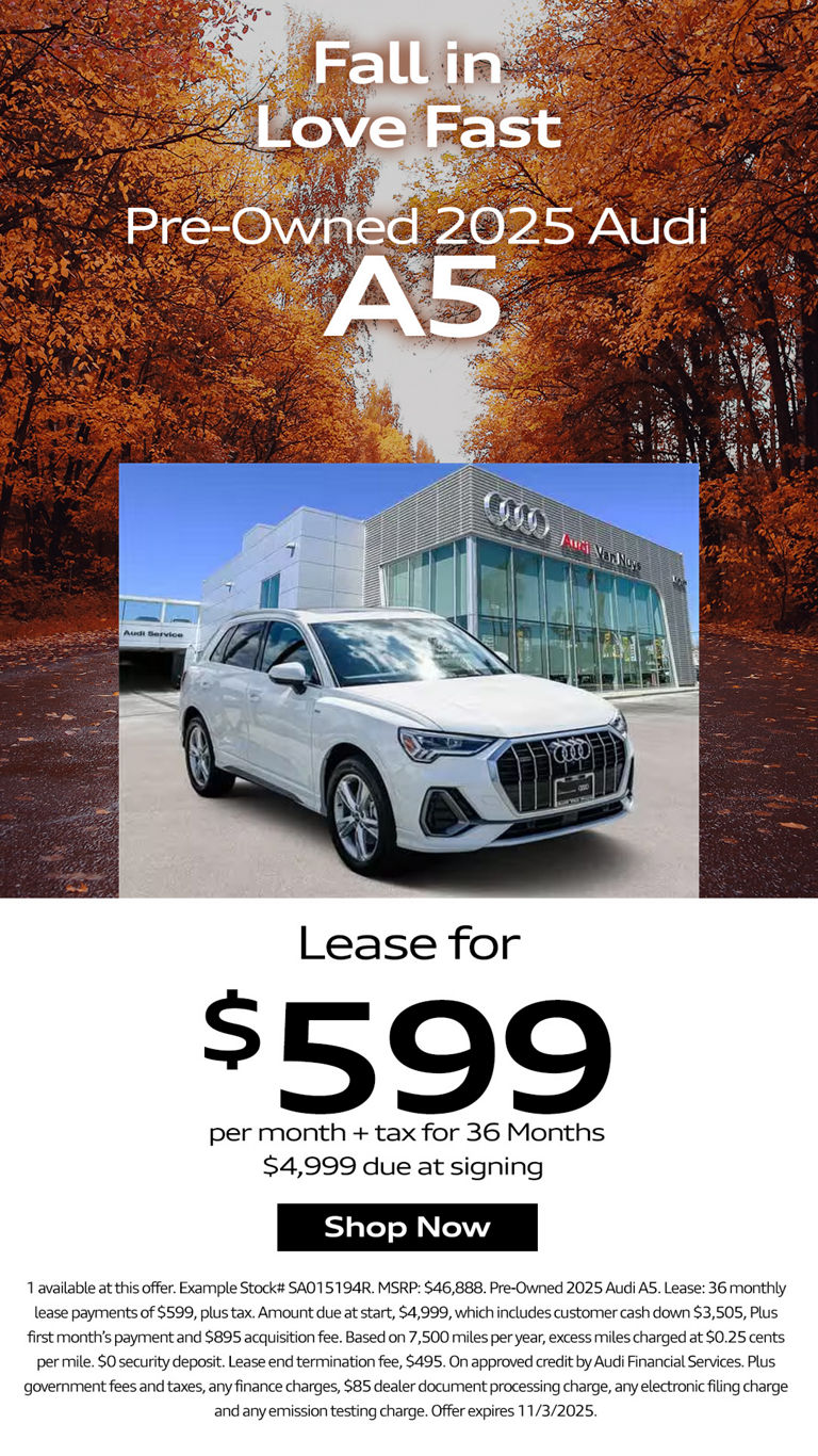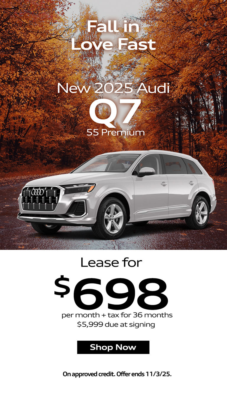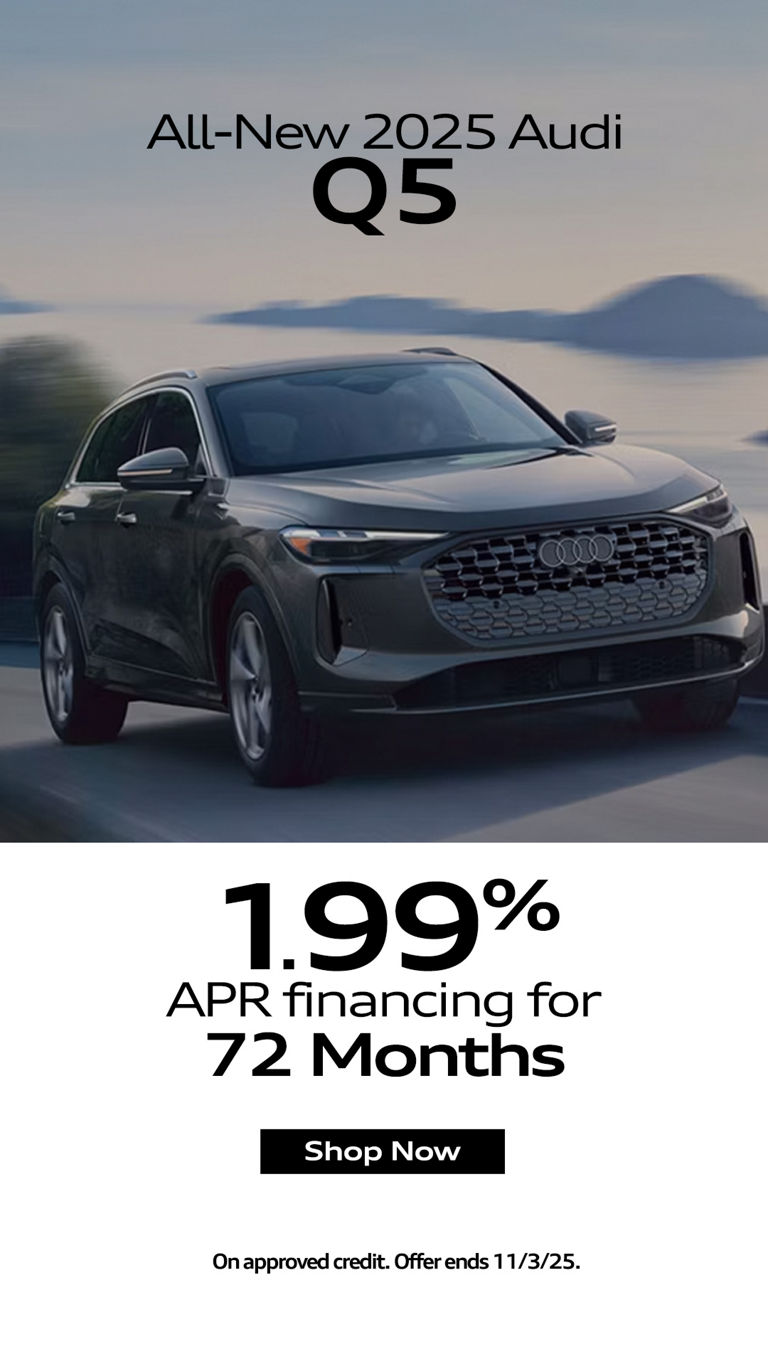 Our Audi dealership provides Los Angeles with the most innovative brand around. You'll find new models such as the 2025 Audi A5, 2025 Audi Q4 e-tron, 2025 Audi Q5, 2025 Audi Q7, and 2025 Audi Q8 e-tron. Audi's lineup is more impressive than it's ever been.